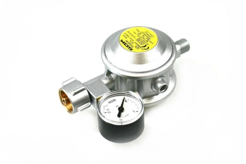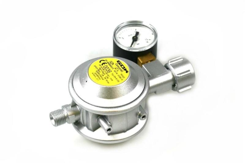 Редуктор с манометром , рабочим давлением 30 мбар,производительностью 1,5 кг/ч . К примеру : 4-конф.плита - >465 г / ч + отопитель- >>500 г/ч + Холодильник 165 л->>>35 г / ч + духовка - >>>>175 г / ч = общий расход 1175 г / ч
